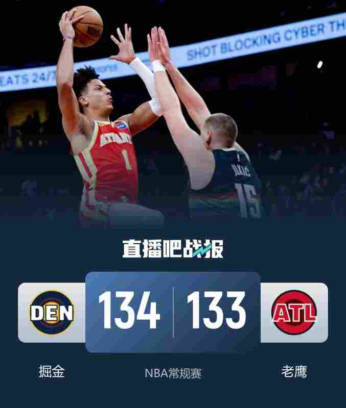 一開場,雙方短暫相持,老鷹外線開火連中4記三分取得兩位數優勢,約基奇狀態不佳,老鷹持續發力不斷擴大領先,分差來到20分以上,次節老鷹火力不減,連續飆中三分保持大比分領先,掘金不斷沖擊內線連投帶罰苦苦支撐,半場戰罷老鷹73-54領先掘金。下半場,掘金大舉反擊,攻防發力轟出19-4的進攻高潮迅速迫近比分,末節老鷹徹底啞火,掘金打出20-0的攻擊波強勢反超,老鷹及時回暖,內外開花追到2分,關鍵時刻約基奇兩罰一中,老鷹絕平三分不中,沃克上籃得手但時間來不及了。最終,掘金23分逆轉,以134-133險勝老鷹。