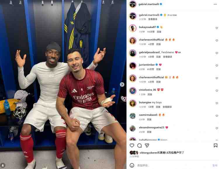 本場比賽馬丁內利打進精彩遠射,馬杜埃凱則是雙響建功。賽后馬丁內利社媒曬出與馬杜埃凱合照,配文寫道:“連勝繼續!”