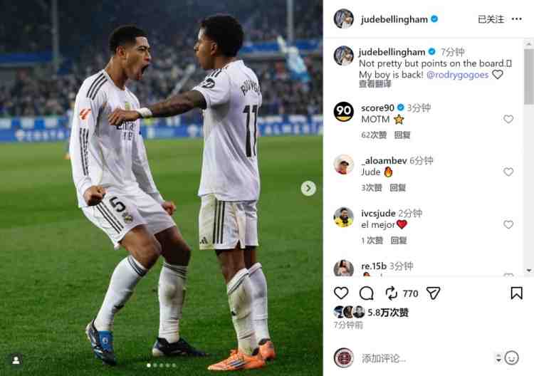 皇馬中場貝林厄姆更新社媒動態,曬出與連場進球的羅德里戈的合照,配文:“贏得不漂亮,但三分到手。我的兄弟回來了!”